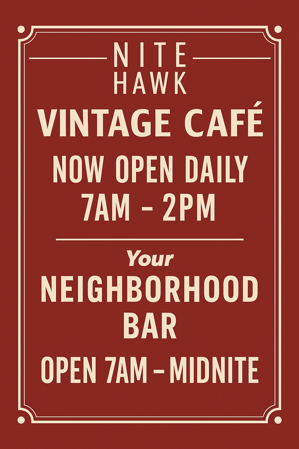 Been serving drinks since your grandpa’s grandpa needed one. Est. 1931. OUR MENU OUR STORY Coffee in the morning. Cocktails in the night. same hours every day. Post us on your story. Tag us, follow and ADD #Nite10, Get a free beer. simple.